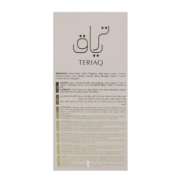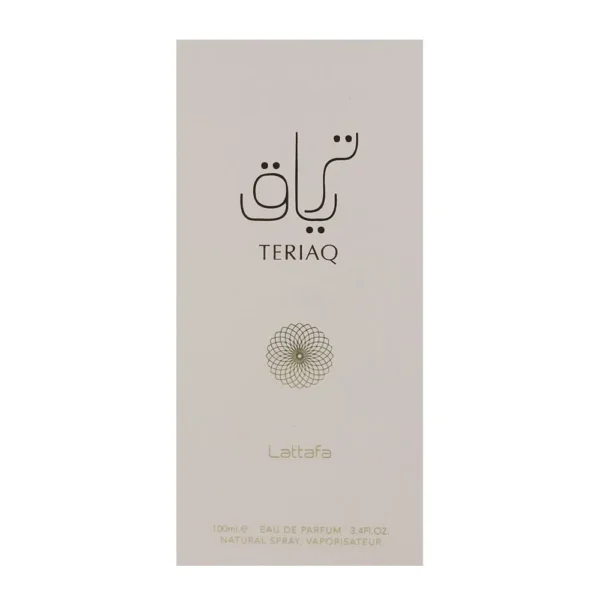 Packaged as a 3.4 oz (100ml) Eau de Parfum spray, Teriaq combines modern elegance with Middle Eastern craftsmanship. Its unisex appeal makes it versatile for daily wear, formal occasions, or as a standout signature scent.